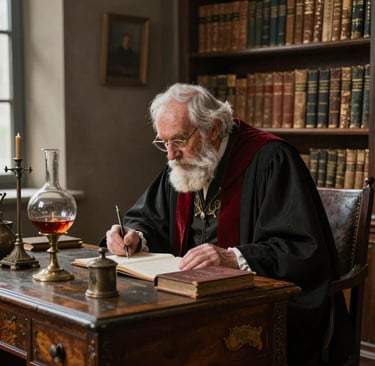 An old man, no name, but the description is familiar, sits at a table in a modest room. On the table is a single book, thick with age and handling. Its cover bears no title. He opens it at random and finds a sentence he does not remember writing, in a handwriting that looks like his: